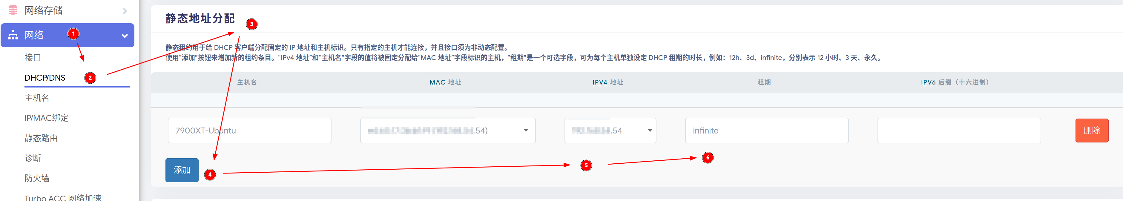 接下来把要走代理的设备分配一个静态ip地址,要ip段小于100,静态地址分配的租期没有意义,直接设置为永久好了(不用设也行)。