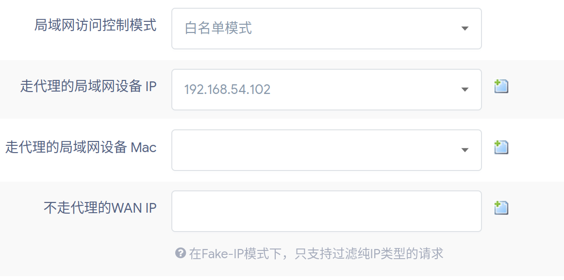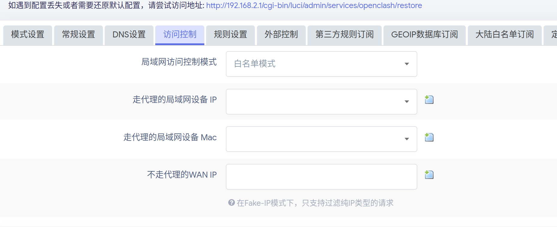 发现在访问控制这里设置需要走代理的设备,个人使用的是白名单模式