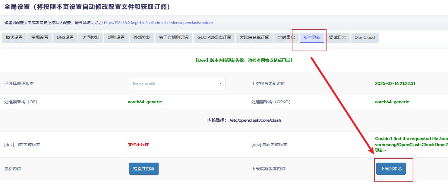 固件里是不自带内核的,需要下载内核,但是直接在r2s里下载很可能因为网络原因导致下载失败,这时候可以先把内核下载到电脑上,再将内核上传到r2s